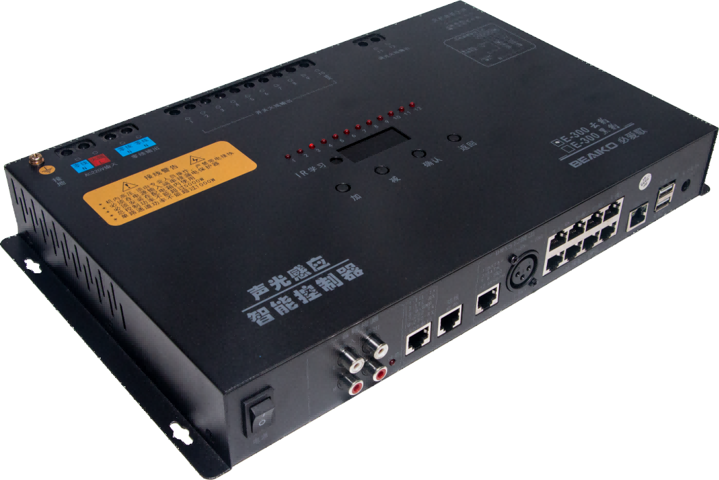 E-300云豹集合了TCP/IP联网模块、继电器开关、可控硅调光、中控、RCA音频检测、SPDIF数字音频检测、空调控制、DMX512控制、U盘下载、WIFI无线调试、功放控制、墙板及门牌灯控制,实现了包房智控的高度一体化集成。
