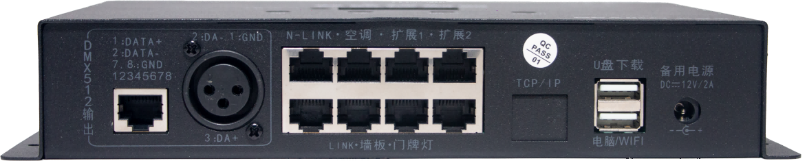 集合了中控、音频检测、Dmx512 控制、U 盘下载、无线/有线网络调试、功放控制、墙板及门牌灯控制,实现了包房智控的高度集成化、一体化。