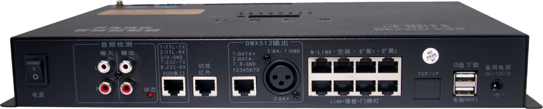 集合了继电器开关、中控、音频检测、Dmx512 控制、U 盘下载、无线网络调试、功放控制、墙板及门牌灯控制,实现了包房智控的高度集成化、一体化。