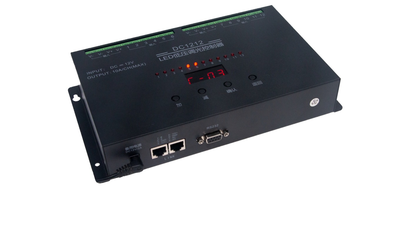 DC1212 LED低压调光控制器,是一款用于控制低压12V LED筒灯、射灯、灯带(主要是CW灯带)等灯具的设备,并提供控制接口进行场景切换。可以由外部RS485墙面板控制,也可以由第三方设备进行RS232串口控制。