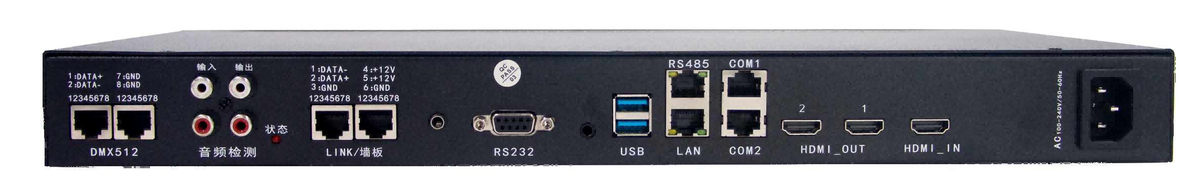 6、 DMX512功能:两路网口,可以通过DMX512信号控制VJ1950的各项功能