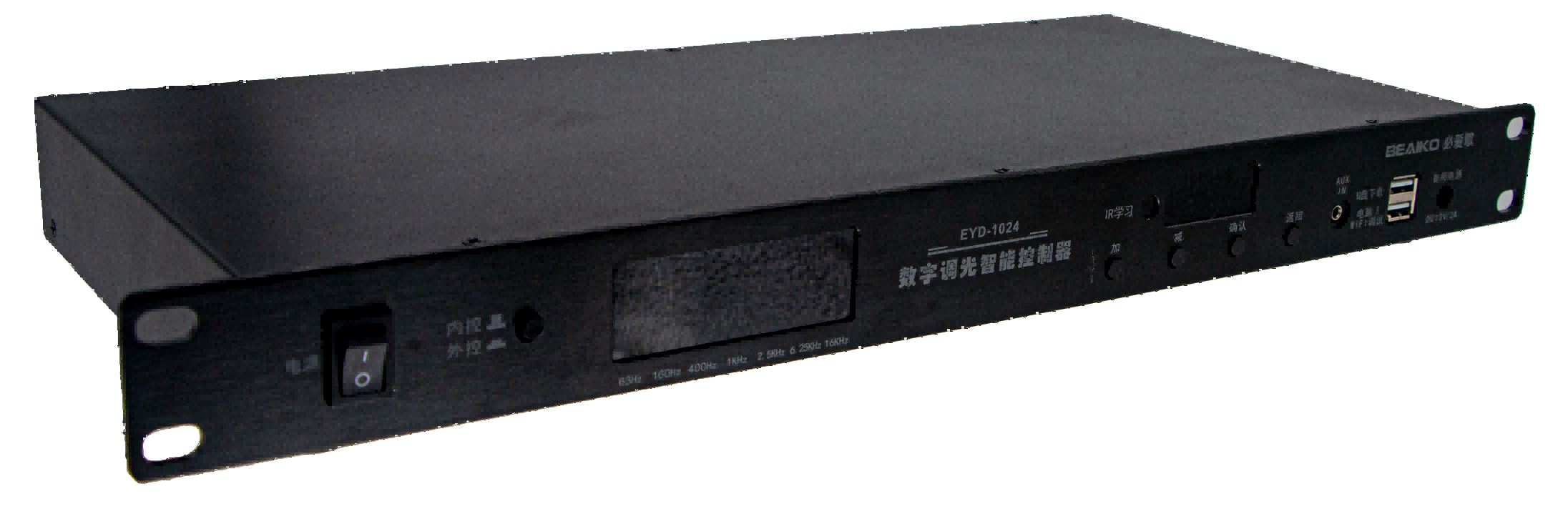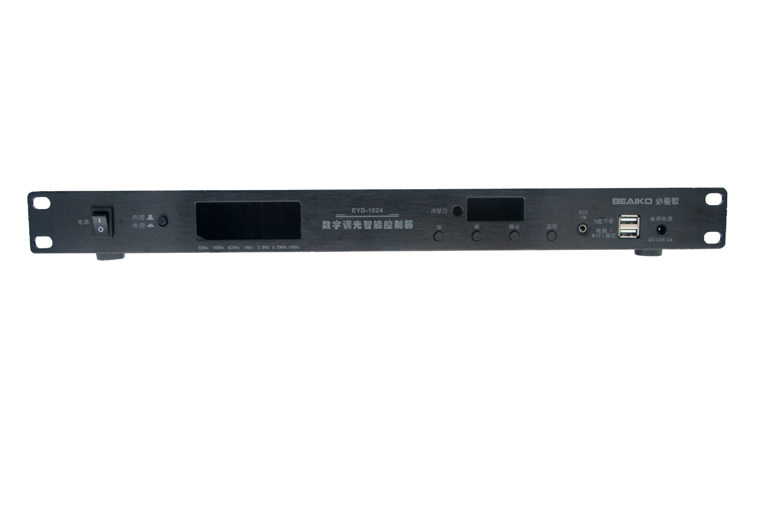 EYD1024是一款应用于多功能厅、宴会厅、清吧等的智能灯控可编程管理系统。有两组DMX512信号输出和两组DMX512信号输入功能,内置音频检测、效果器控制、内控外控切换、频谱显示,控台连接等功能,通过配线盒与点歌机连接可实现声光联动的功能。